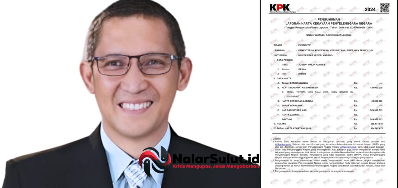 Berdasarkan penelusuran nalarsulut dari laman resmi elhkpn.kpk.go.id, Rabu, (14/01/2026) Joseph Philip Kambey melaporkan harta kekayaannya pada 30 Maret 2025, dengan jenis laporan Periodik 2024, saat masih menjabat sebagai Dekan FEB UNIMA.