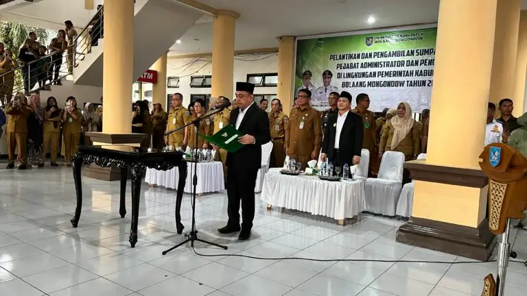 Prosesi pelantikan dan pengambilan sumpah jabatan digelar di kompleks perkantoran Bupati Bolmong, Senin (9/2/2026), menjadi penanda dimulainya babak baru tata kelola pemerintahan Bolmong.